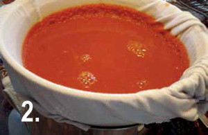 Now stir the juice with a spoon, scraping the bottom of the fabric to allow the liquid to pass through. The tomato fragments will remain behind, caught by the cloth.