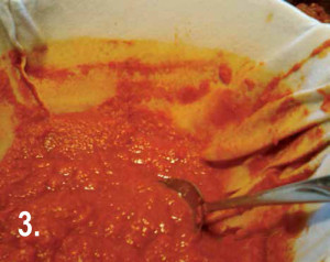 Secondly, run the tomatoes through a food mill extracting the juice. I usually take the remaining waste and run it through my food mill again to get as much of the pulp out as possible. Now you will have tomato juice. Pour juice into a colander lined with a tight weaved fabric, like a piece of old sheet — flannel works nicely.