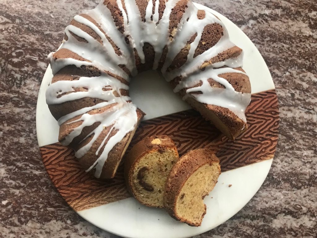 Drizzle cooled cake with confectioner’s sugar glaze.