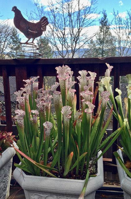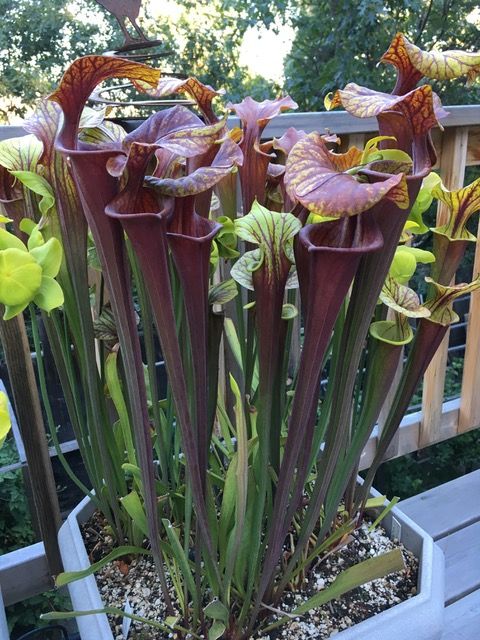 “Sarracenia make great patio plants if your water is low in dissolved salts and you have a location with lots of sun,” John Brittnacher, Vice President of the International Carnivorous Plant Society says. He adds, “For Sarracenia, the plants should be bog pots with drain holes in the sides so water is retained in the pot. During warm weather, they must be watered every day.”