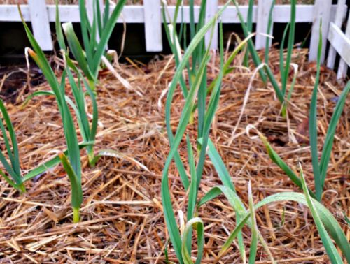 Mulch your garlic with about 4 inches of chopped straw, leaves or hay. The mulch will keep the soil temperature more constant through the winter, which will retain moisture, keep weeds down and help the roots remain in place. And that’s it. Basically you can forget about it until spring. No watering, no attention needed.