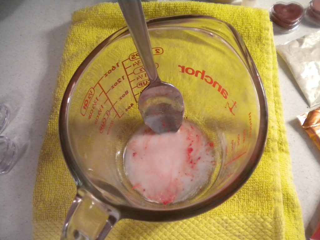 Making lipstick yourself does require a few key materials. First, you need a lip balm base. You can purchase a premixed base or make one yourself (instructions to follow). For the pigment, you want lip-safe mica. Mica is a silicate mineral found as minute scales in granite and other rocks or as crystals and is used as cosmetic and soap ingredients. In order to be considered lip-safe, a product must be safe to ingest as we do invariably end up ingesting some of our lipstick through normal activities such as eating. If you desire your lipstick to be opaque, titanium dioxide is a must; otherwise you will have sheer lip gloss. You need a heat-safe container for mixing (I use a glass measuring cup with a pour-spout), mixing and scooping instruments (small spoons work well), and a container to house your finished product. I use both lip balm tubes and lip gloss dishes purchased at soapmaking resource suppliers. I do prefer the tubes for ease of use, however. Last but not least, you will need some way to heat and melt your lip balm base for mixing and pouring. You can either place your heat-safe container in the microwave for short bursts of heat, or you can place your container in a (very) hot water bath. The hot water bath may take longer, but it will keep a more consistent temperature for working and pouring. If you use this method, I recommend keeping the container in the water bath as you are mixing colors. If you desire a flavor to your lipstick, there are safe flavor oils you can purchase or some essential oils you can use (be sure they are not the photosensitizing ones).